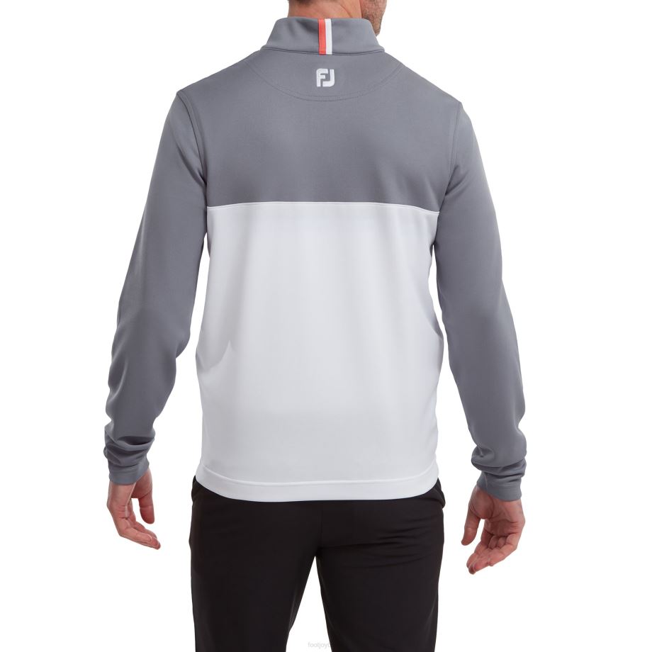 - estilo em bloco de cores com zíper contrastante em dois tons e detalhes na gola traseira