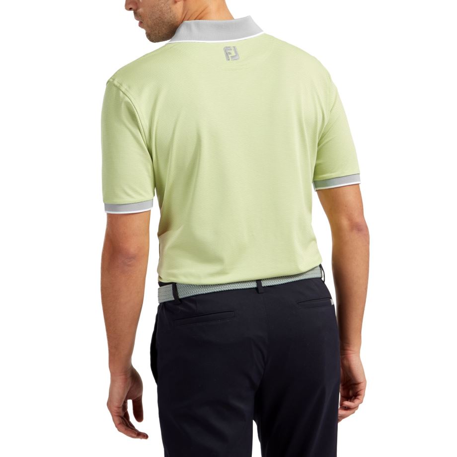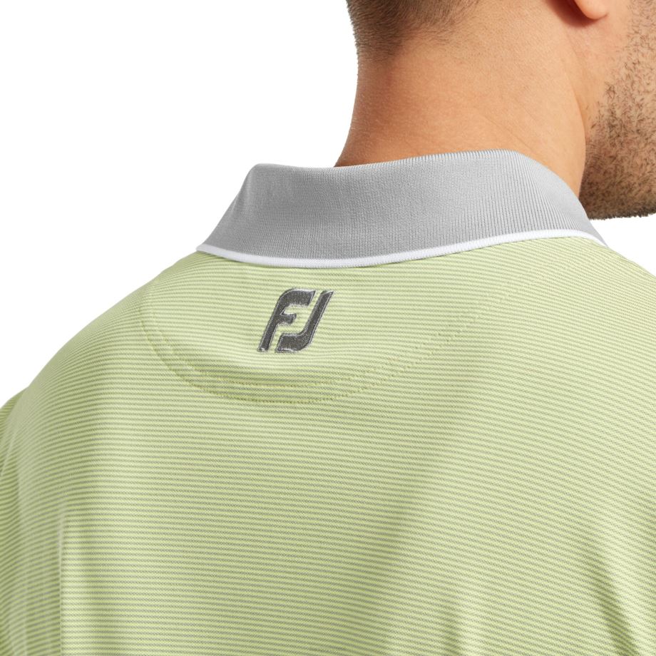 - tecido piquê elástico fj prodry em todo o layout de minilistras em dois tons, gola e punhos em malha canelada de cor sólida, cores contrastantes na gola e nos punhos