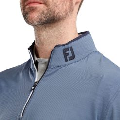 - tecido elástico de malha jérsei supermacio em todo o padrão de microlistras de dois tons, construção com meio zíper em dois tons, gola contrastante e detalhes de ventilação lateral, gola coordenada e encaixe traseiro, logotipo fj’s easy tecido de cuidado para minimizar rugas