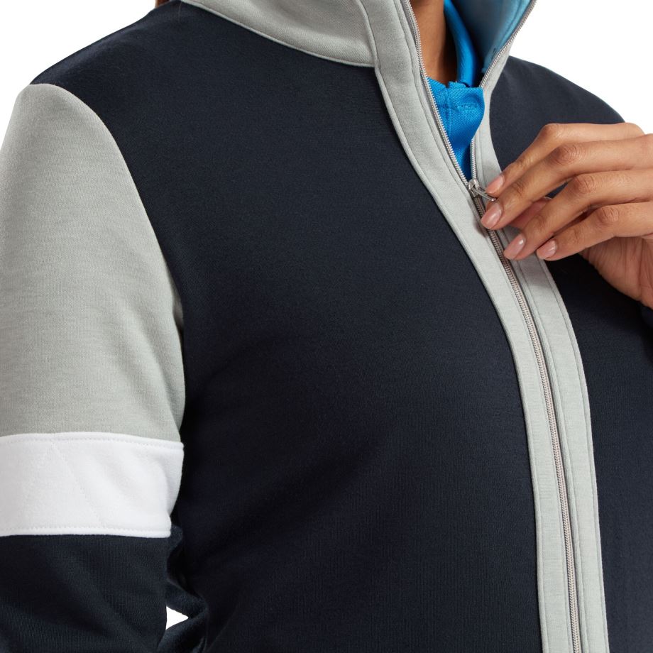 - tecido de malha terry francês supermacio, multicolorido, padrão bloqueado, costura retrô projetada na faixa da manga, zíper de metal de comprimento total e puxador traseiro tonal, logotipo fj, tecnologia de absorção de umidade, afasta a umidade do corpo